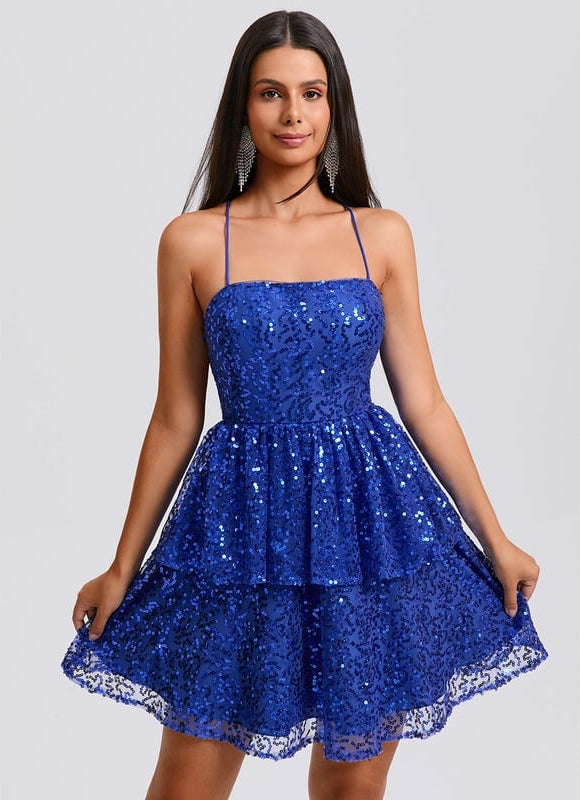 Brillez de mille feux avec notre Trapèze col droit court paillette robe de bal de promo