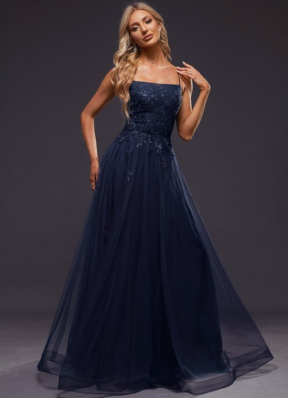 Éblouissez avec notre Trapèze col droit longueur ras du sol tulle robe de bal avec paillettes