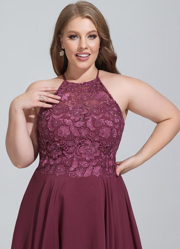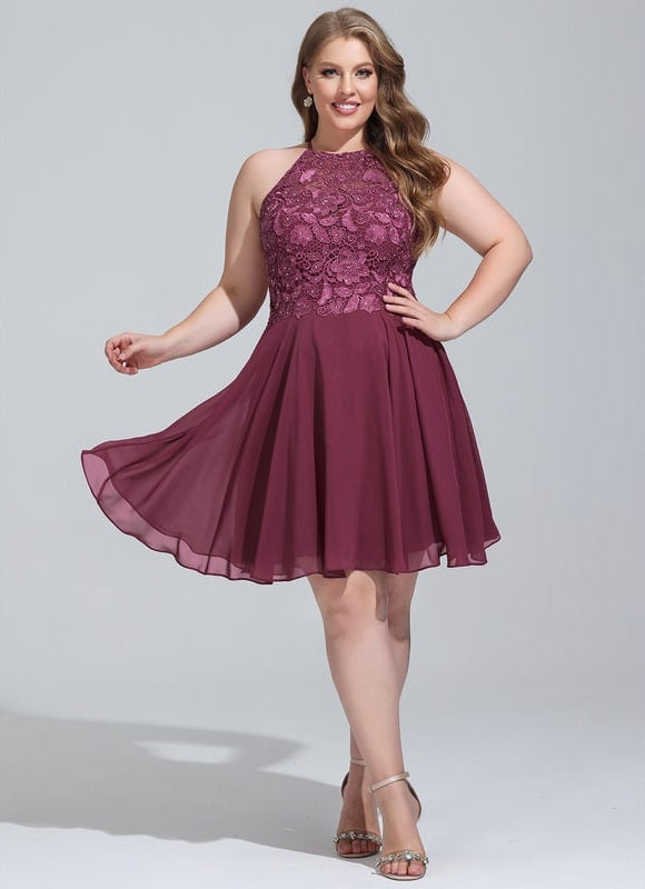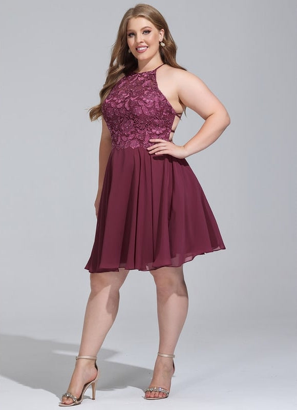 Éblouissez avec notre Trapèze col rond longueur genou mousseline robe de bal de promo avec perles