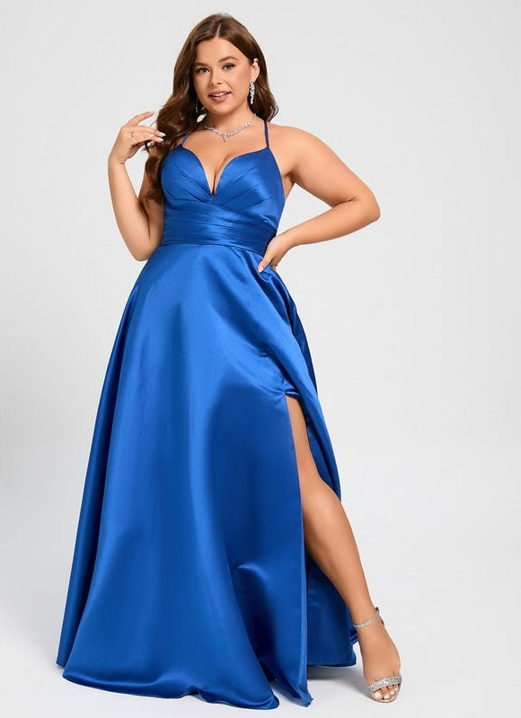 Éblouissez avec notre Robe de Bal Trapèze Col V Longueur Ras du Sol en Satin avec Plissée