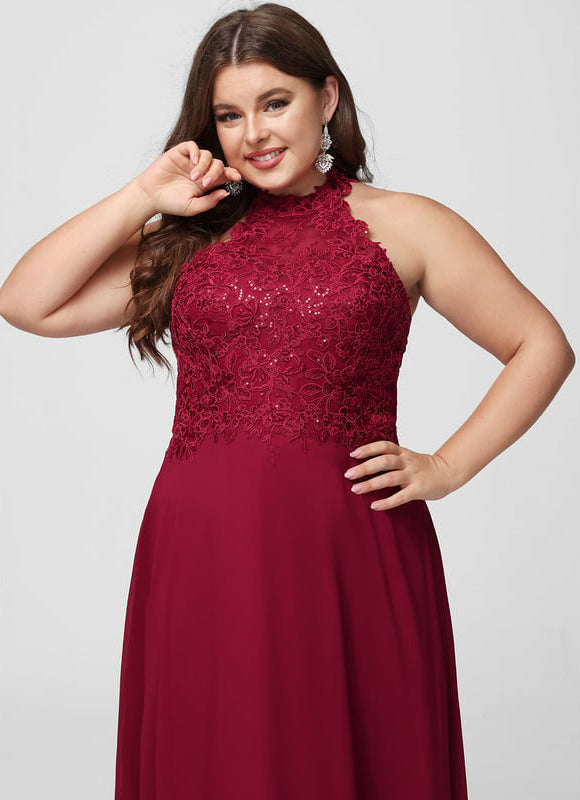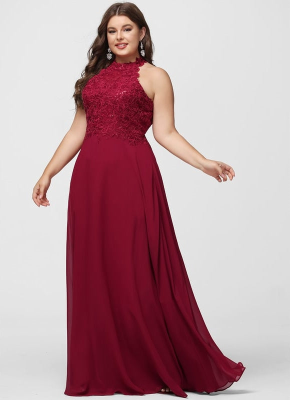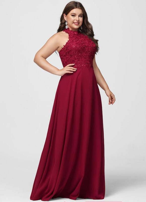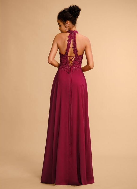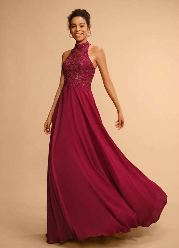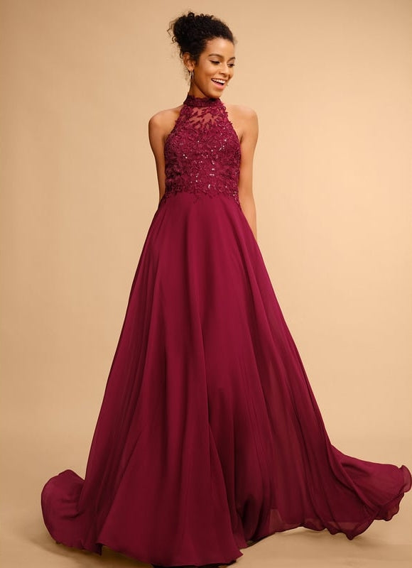 Faites sensation avec notre sublime robe de bal : Trapèze licou longueur ras du sol dentelle mousseline robe de bal avec paillettes