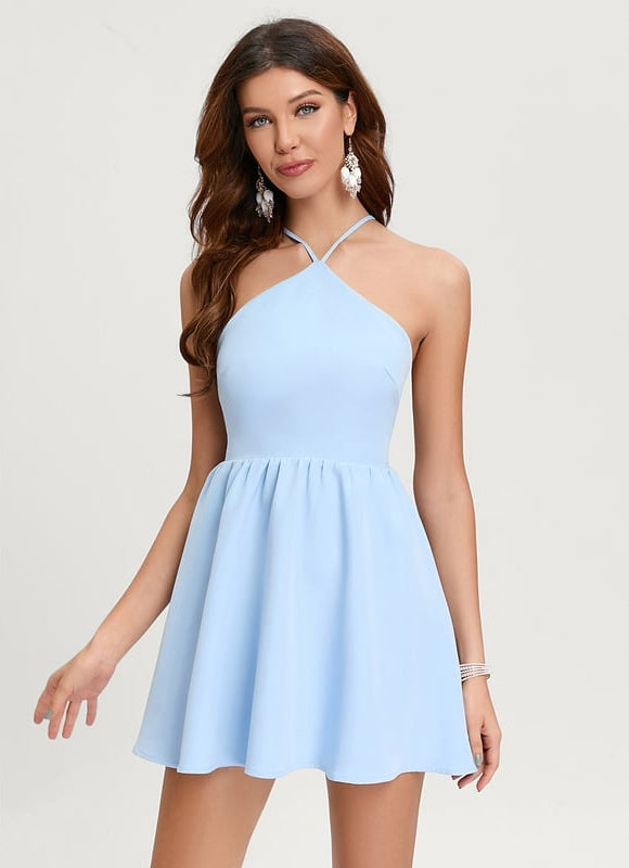 Cette Trapèze licou mini polyester robe de bal de promo est une véritable pépite de la mode. Son design ingénieux combine un col licou qui sublime délicatement votre port de tête et vos épaules, avec des bretelles croisées dans le dos pour une touche d'originalité et un maintien parfait. La silhouette trapèze, évasée à partir de la taille, offre un confort incomparable et une liberté de mouvement appréciable, idéale pour danser toute la nuit. Sa longueur mini apporte une touche jeune et dynamique, parfaite pour mettre en valeur vos jambes. Fabriquée en polyester de haute qualité, cette robe offre un tombé impeccable et une sensation agréable sur la peau. Sa couleur bleu ciel, douce et rafraîchissante, est parfaite pour les événements printaniers et estivaux, vous assurant un look frais et mémorable.